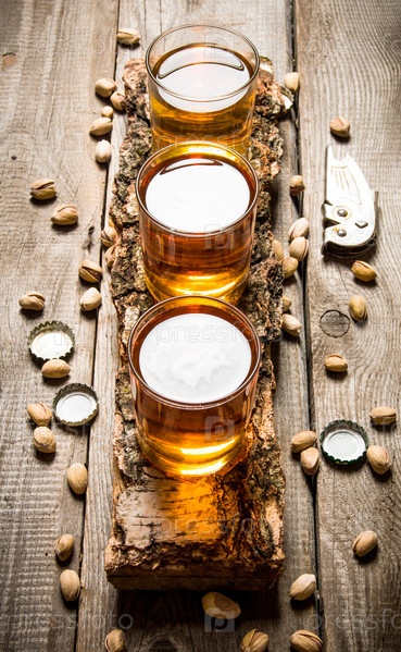 Три сорта пива с фисташками вокруг