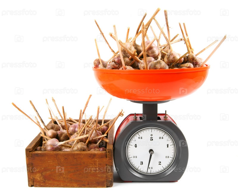 Чеснок на весах и в коробке