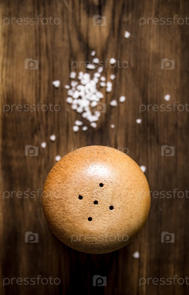 Соль с крупной солью. На деревянном фоне