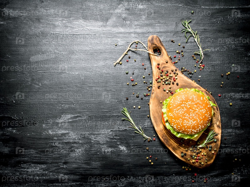 Гамбургер на деревянной доске. Вид сверху
