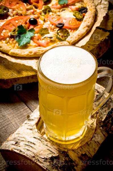Стакан пива и пицца на деревянном столе