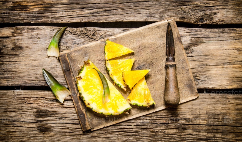 Нарезанный свежий ананас с ножом на разделочной доске