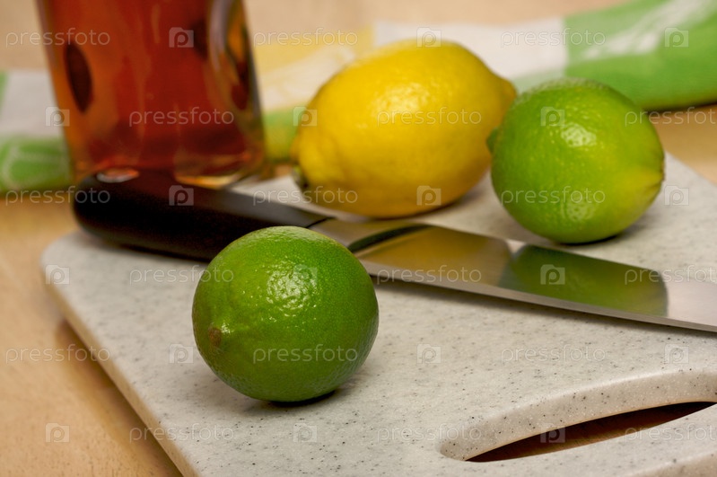 Лаймы, лимон и нож на разделочной доске