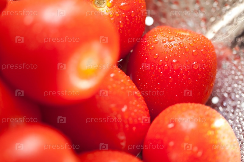 Свежие помидоры в дуршлаге с каплями воды