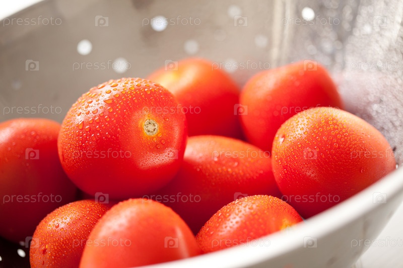 Свежие помидоры в дуршлаге с каплями воды