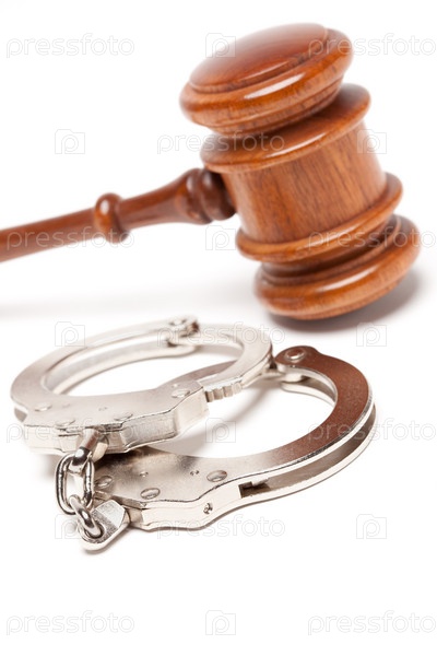 Молоток и наручники на белом фоне