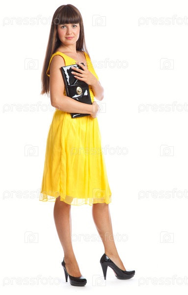 Красивая женщина в желтом платье с сумками