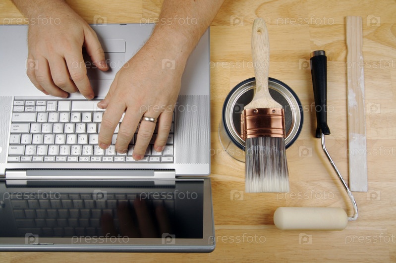 Разнорабочий работает на ноутбуке