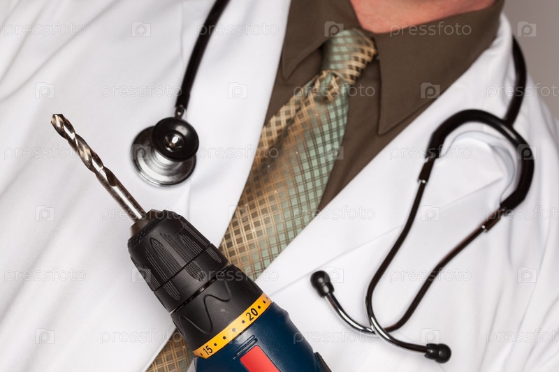 Доктор со стетоскопом и большой дрелью