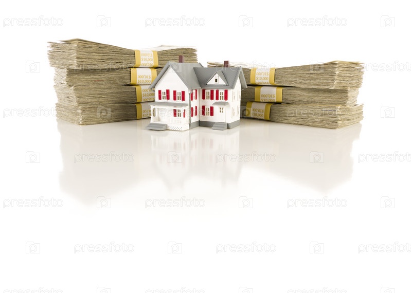 Пачки денег и домик на белом фоне
