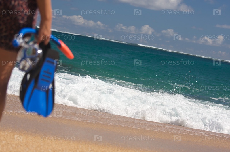 Женщина с ластами и маской в руках на берегу моря