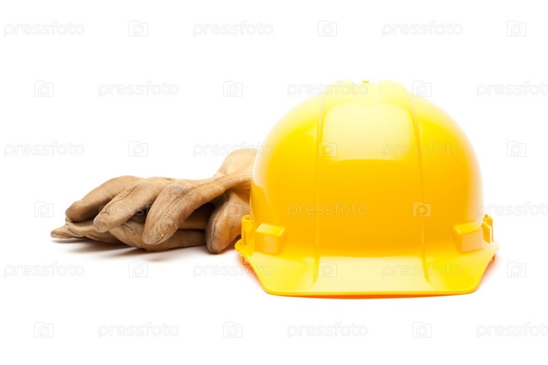 Желтая каска и перчатки на белом фоне