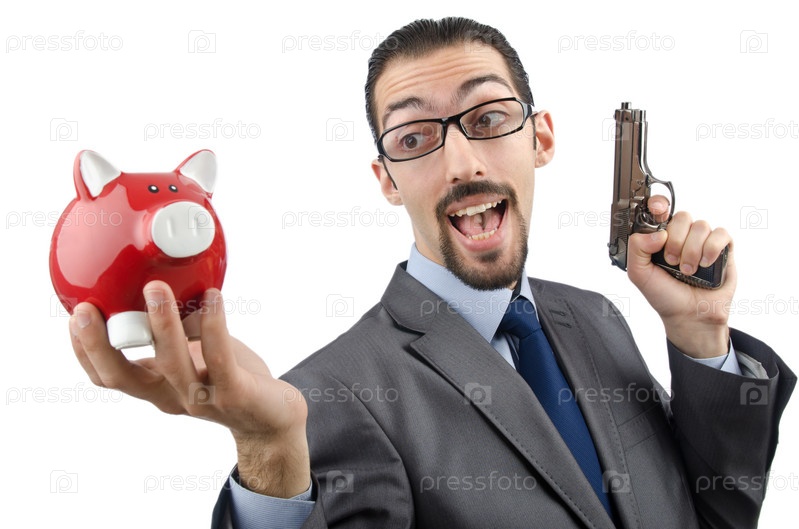 Бизнесмен с копилкой и пистолетом