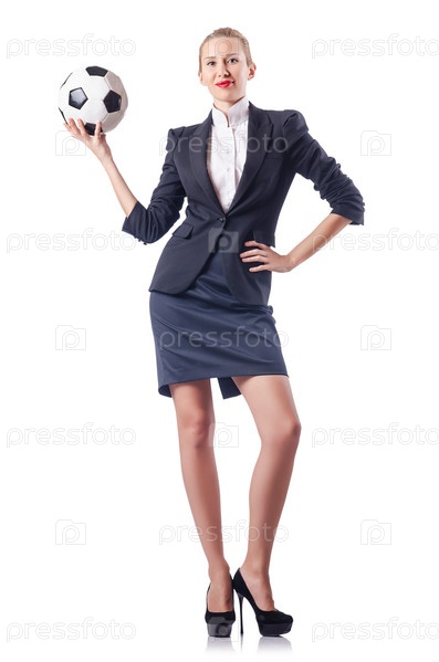 Бизнес-леди с футбольным мячом на белом фоне