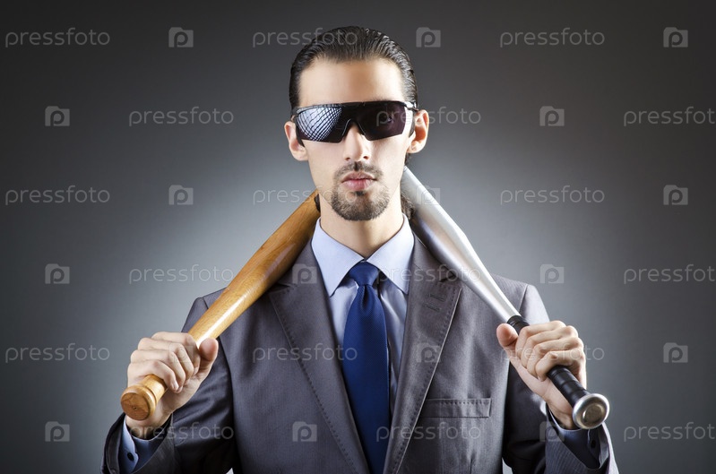 Злой бизнесмен с битой на темном фоне