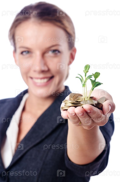 Бизнес-леди с ростком и монетами