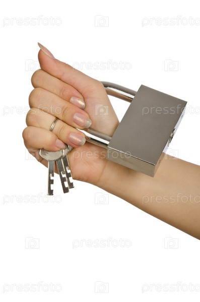 Висячий замок с ключами в женской руке на белом фоне