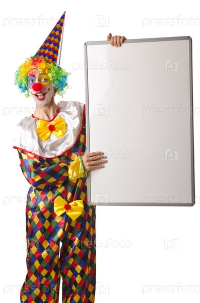 Забавный клоун с пустым плакатом на белом фоне