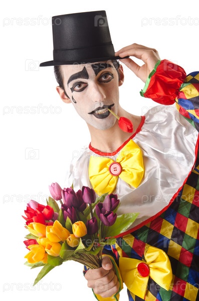 Печальный клоун с букетом тюльпанов на белом фоне