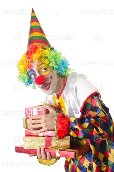 Забавный клоун с подарками на белом фоне