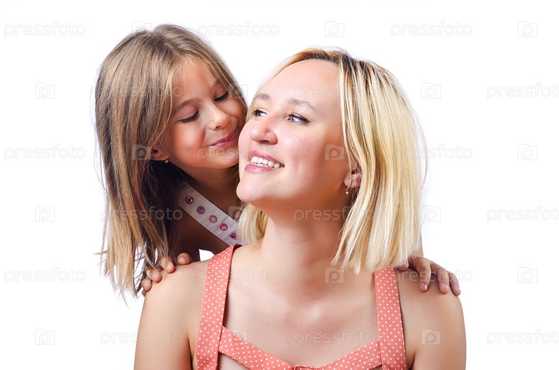 Счастливая мать и дочь на белом фоне