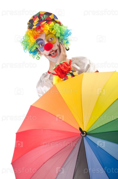 Забавный клоун с зонтом на белом фоне