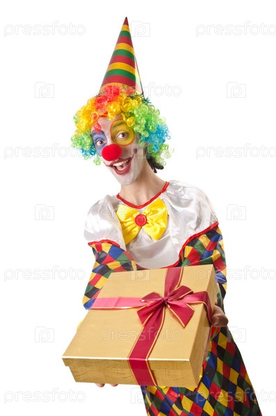 Забавный клоун с подарком на белом фоне