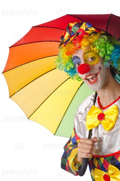 Забавный клоун с зонтом на белом фоне