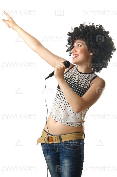 Поющая в микрофон женщина с африканской прической на белом фоне