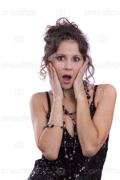 Модная женщина в черном платье и выглядит удивленной