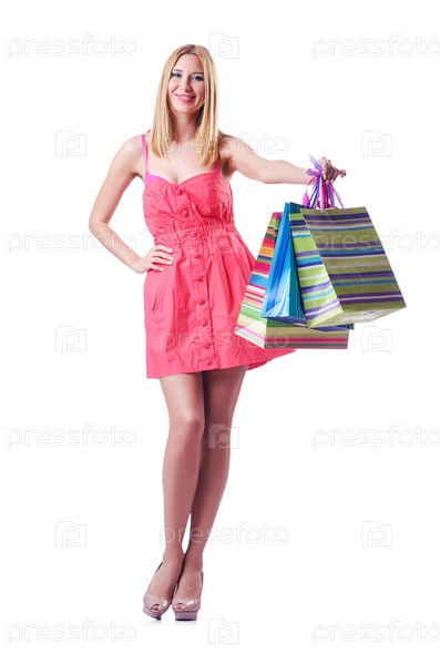 Концепция шопинга, женщина на белом фоне