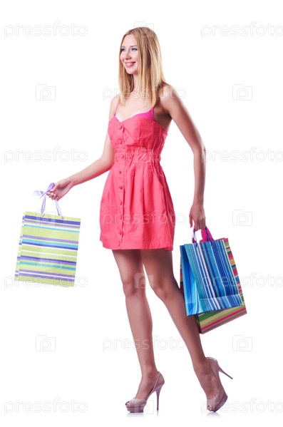 Концепция шопинга, женщина на белом фоне