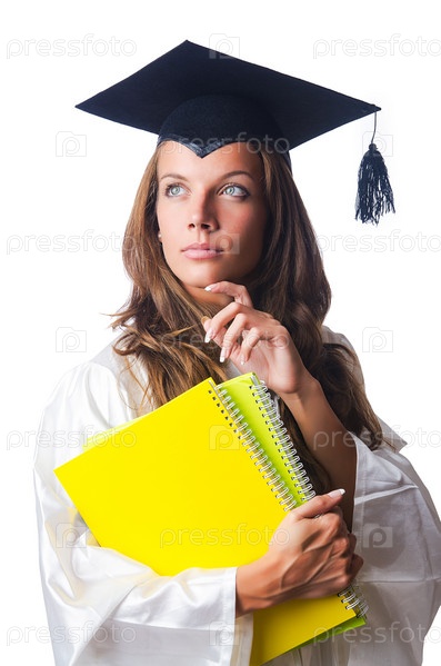 Девушка-выпускница с тетрадями на белом фоне