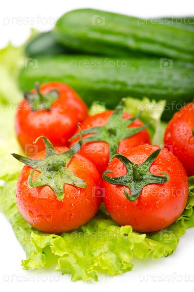 Огурцы и помидоры с листьями салата крупным планом