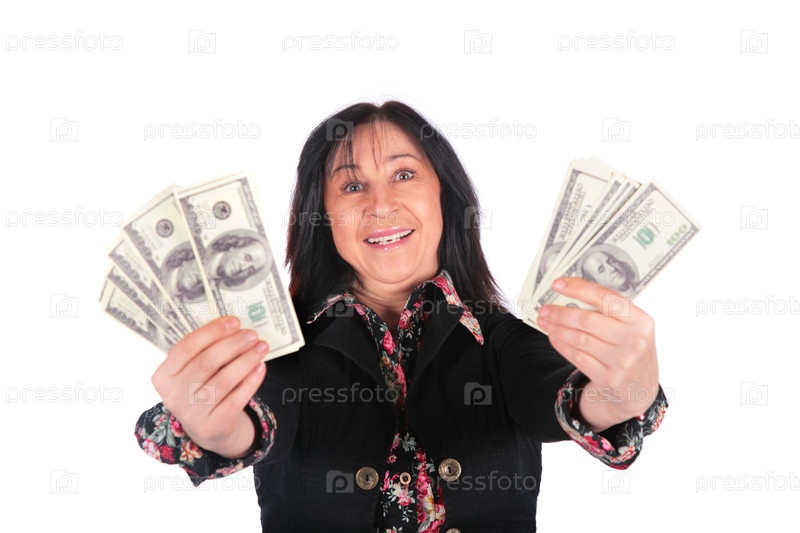 Радостная женщина с деньгами веером в руках