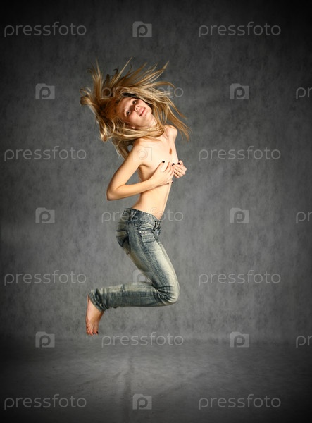 Полуобнаженная женщина в джинсах в прыжке