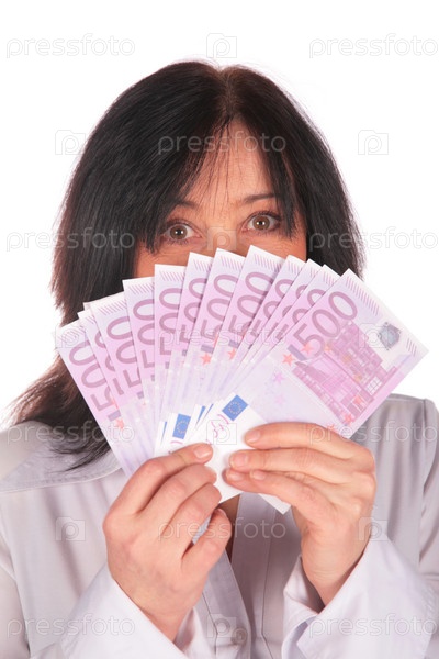 Радостная женщина с деньгами веером в руках