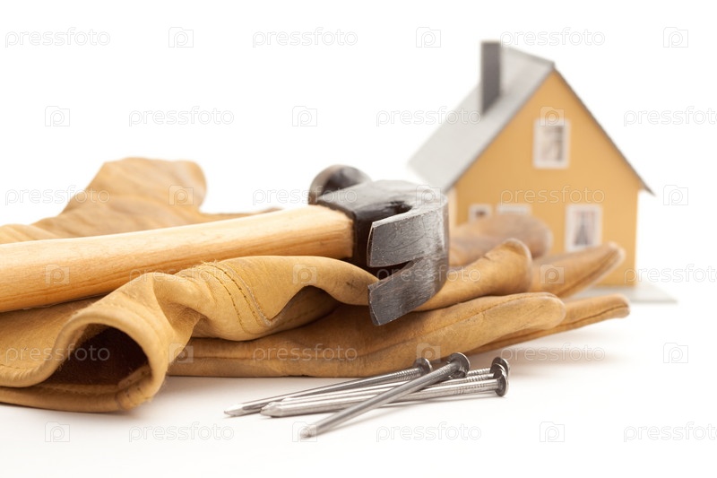Молоток, перчатки, гвозди и дом