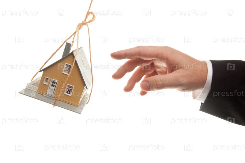 Деловой человек раскачивает подвешенный дом