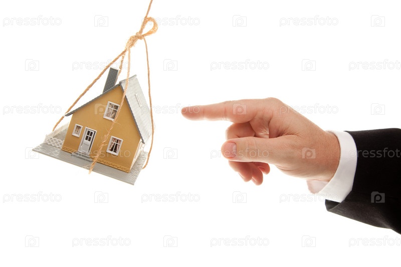 Деловой человек раскачивает подвешенный дом