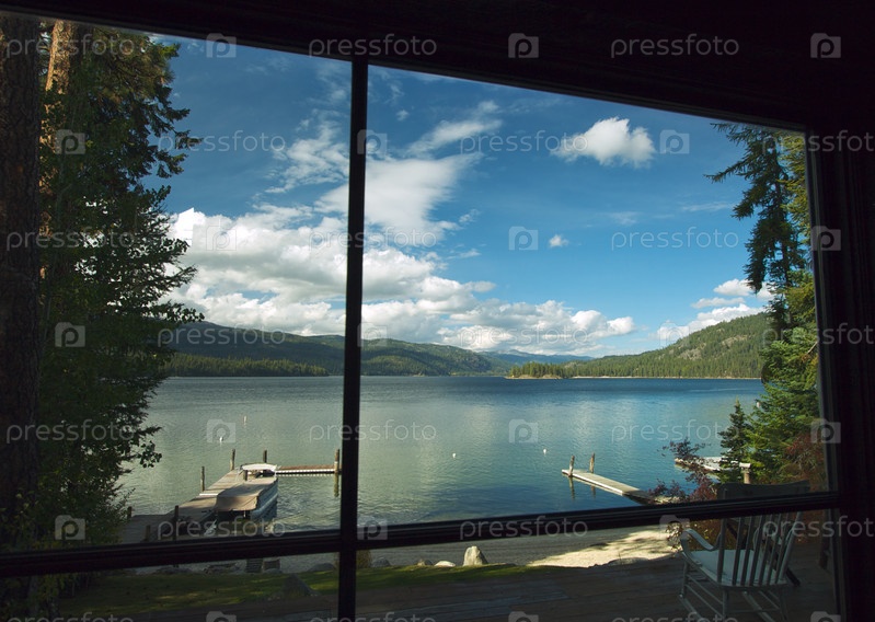 Красивый вид на озеро и горы из окна