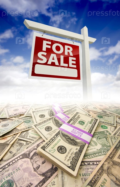 Табличка о продаже недвижимости на фоне долларов