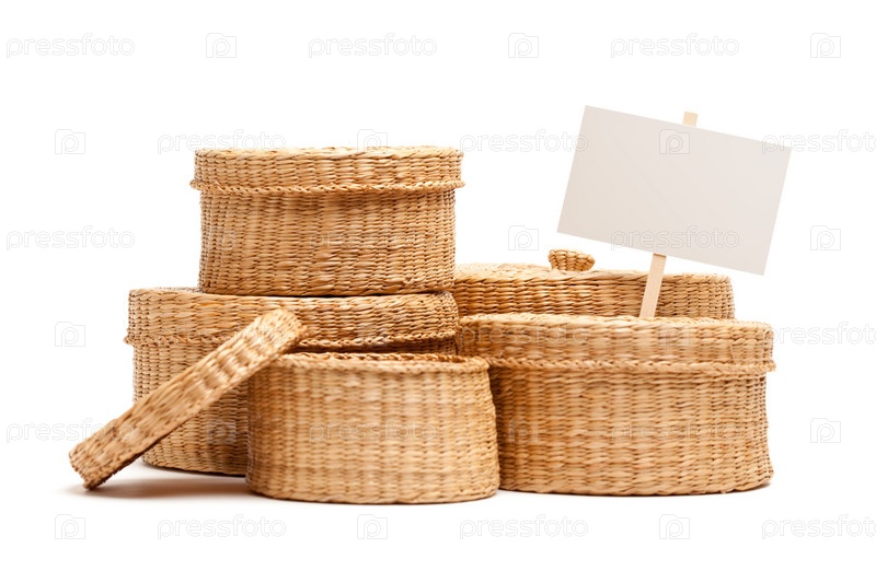 Плетеные корзины разного размера и пустая табличка на белом фоне