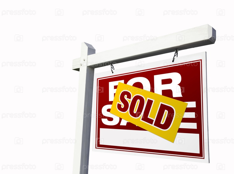 Красный знак продажи недвижимости с надписью "продано" на белом фоне