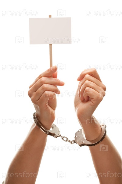 Женщина в наручинах, держащая пустой белый знак, изолировано на белом