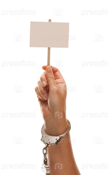 Женщина в наручинах, держащая пустой белый знак, изолировано на белом