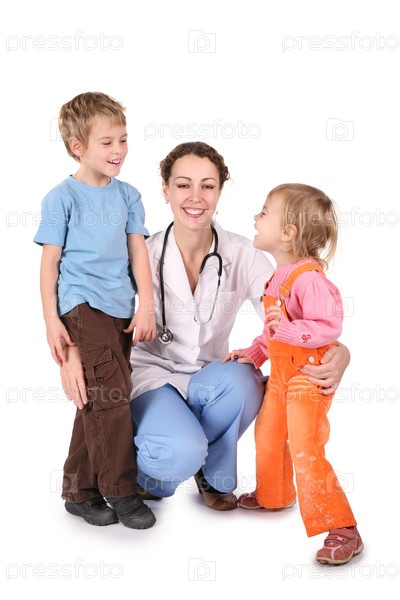 Женщина-врач и дети, изолированные на белом фоне