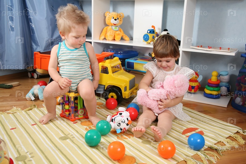 Двое детей в игровой комнате с игрушками