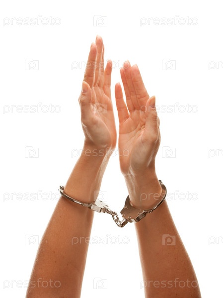Женские руки в наручниках в воздухе на белом фоне