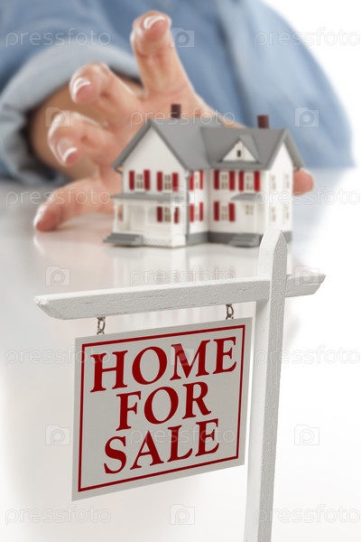 Женская рука тянется к дому и знак о продаже недвижимости